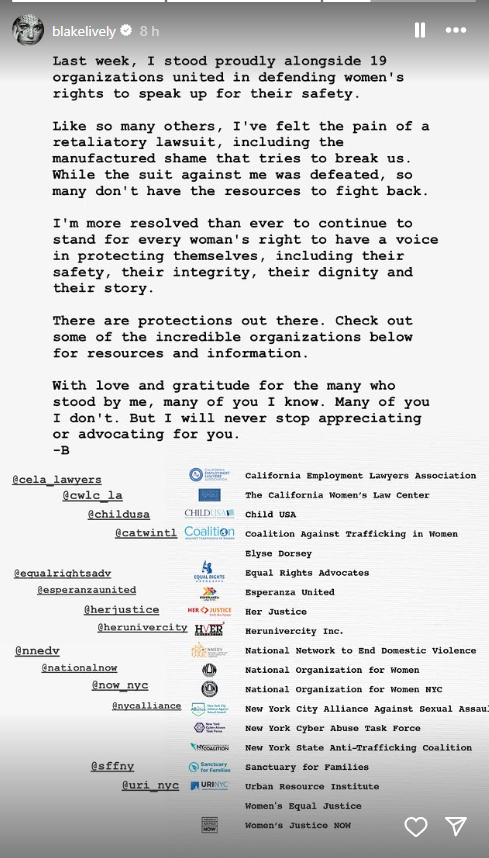 Blake, 37, expressed relief and gratitude through Instagram Stories, while sharing several organizations actively fighting for women’s rights.