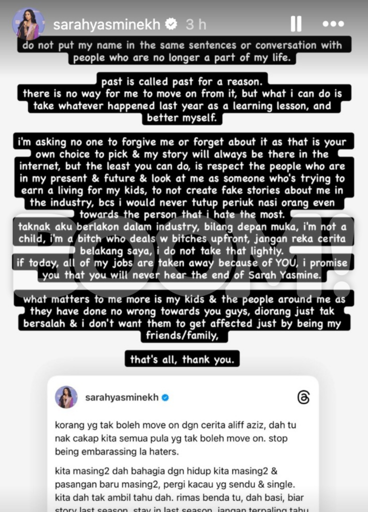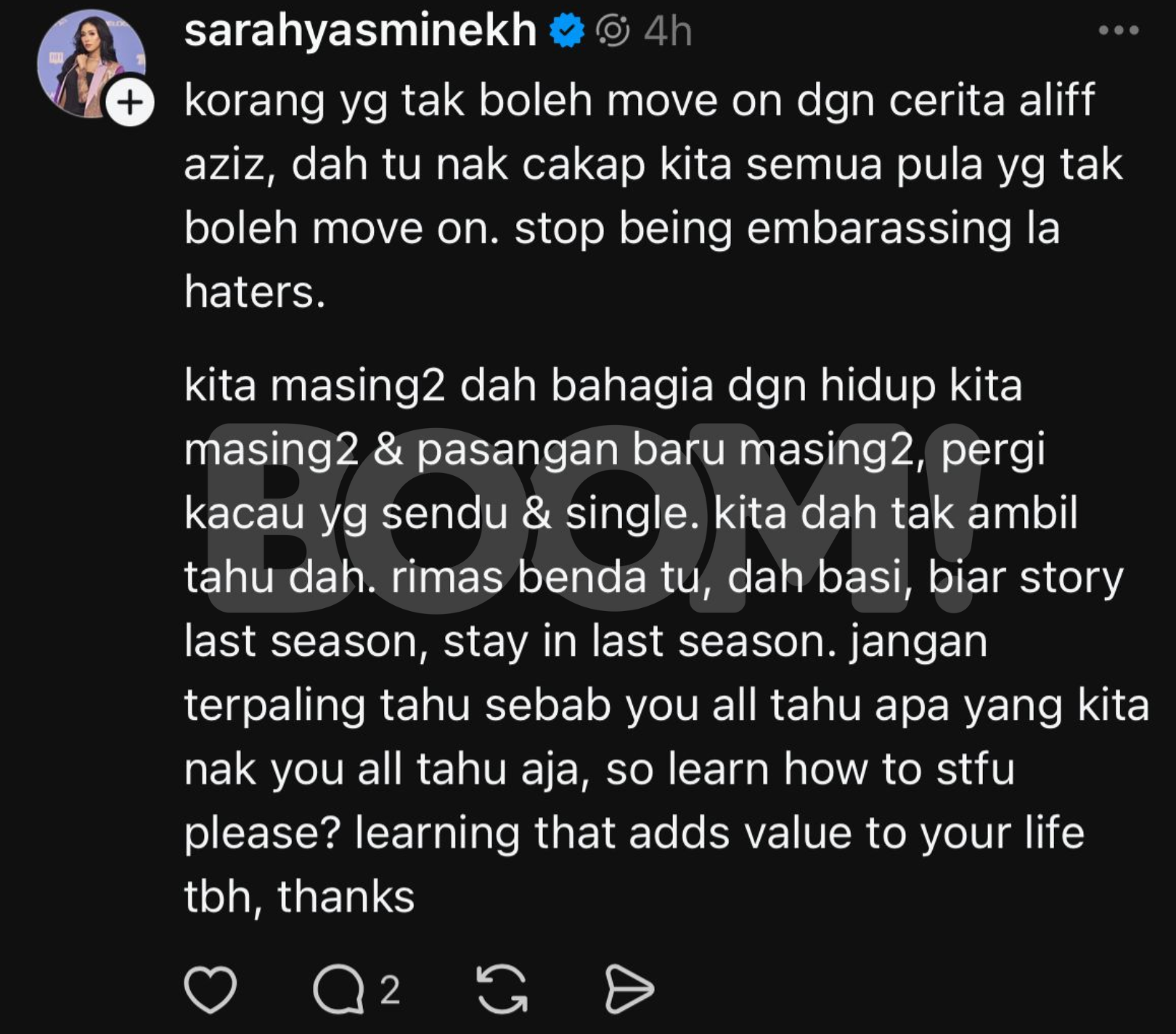 Social media personality, Sarah Yasmine has called out some netizens who continue to link her to past controversies, particularly those involving actor, Aliff Aziz.