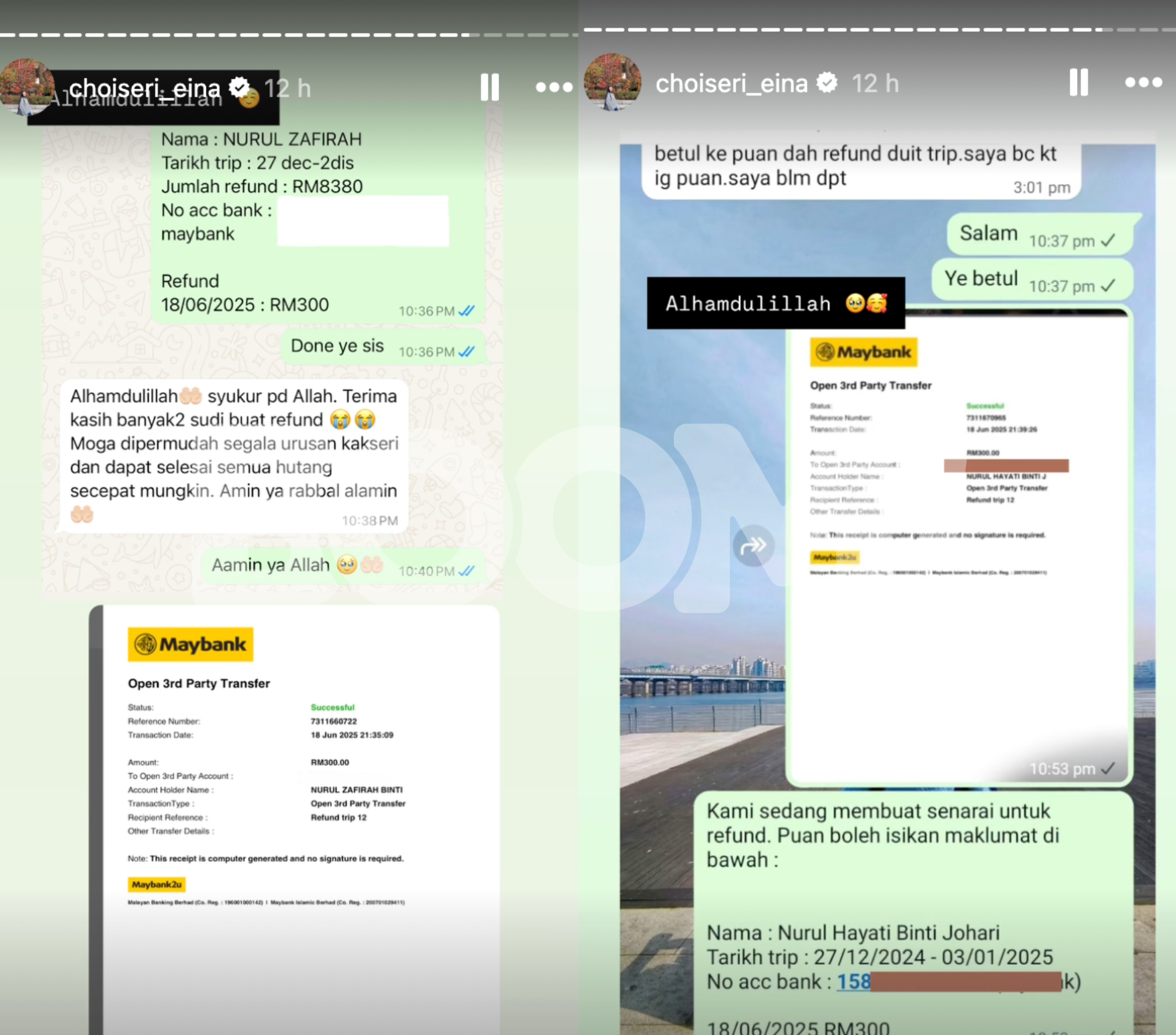 Through her Instagram Story, Kim Seri shared several screenshots of refund proof, showing initial transactions of RM300 per person to three customers, to be paid in stages until the full amount is settled.