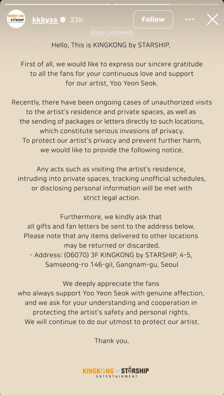 Agensi KINGKONG by STARSHIP menegaskan bahawa mereka akan mengambil tindakan undang-undang tegas terhadap individu yang melanggar privasi pelakon terkenal, Yoo Yeon-seok.