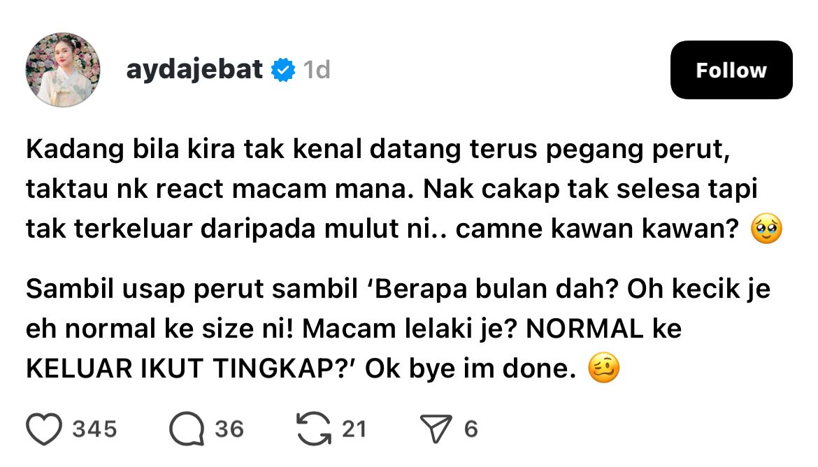 Melalui satu hantaran di Threads, Ayda berkongsi perasaannya apabila berdepan situasi tidak selesa itu sambil meminta pandangan netizen mengenai batasan yang wajar.
