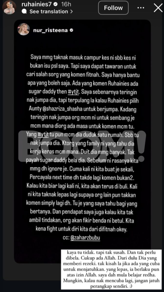 Dalam perkembangan sama, kakak kepada Ruhainies iaitu pelakon Risteena Munim tampil mempertahankan adiknya yang menjadi mangsa fitnah.
