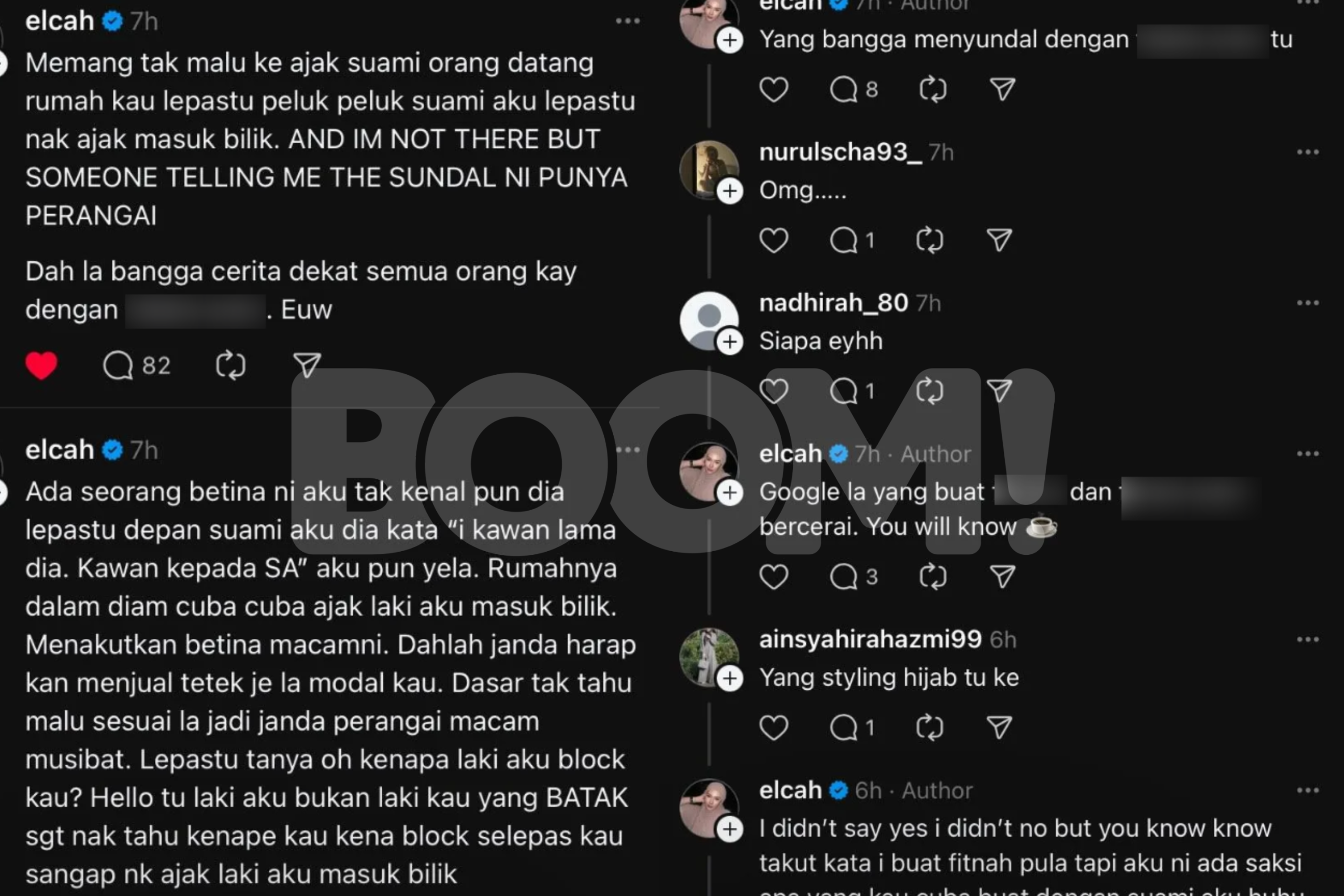 Dalam satu hantaran panas di Threads, Elcah mendedahkan wanita terbabit bukan sahaja berani mengajak suaminya ke rumah, malah bertindak memeluk dan cuba masuk bilik bersama lelaki itu.