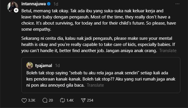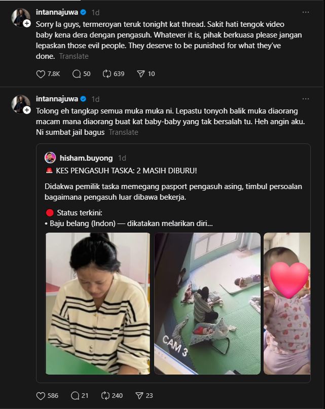 Intan turut menggesa pihak berkuasa memperketatkan saringan serta ujian kesihatan mental terhadap individu yang ingin bekerja sebagai pengasuh, khususnya melibatkan penjagaan bayi.