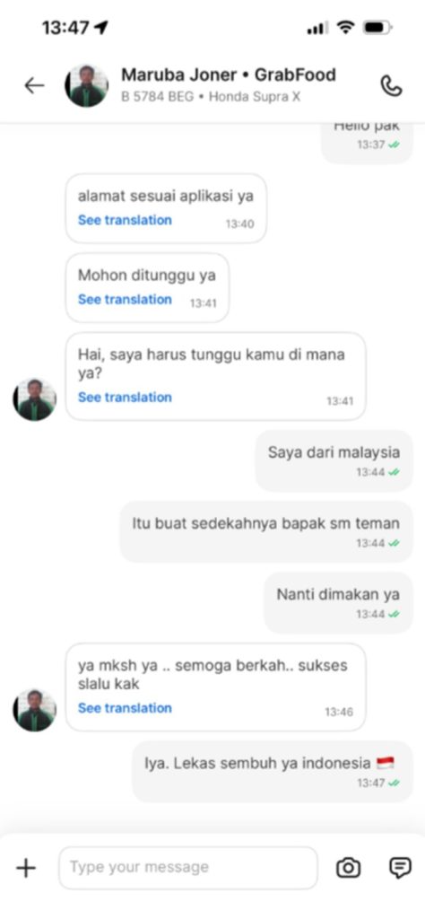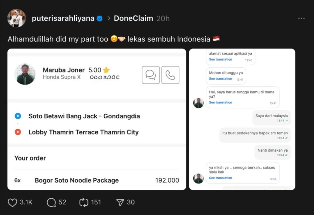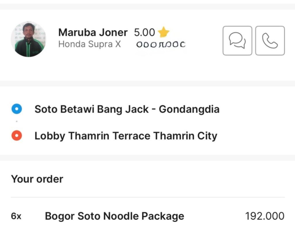 Menerusi perkongsian tangkap layar mesej, Sarah membuat pesanan makanan dari restoran Soto Betawi Bang Jack di Jakarta yang diterima oleh seorang pemandu ojek bernama Maruba Joner.
