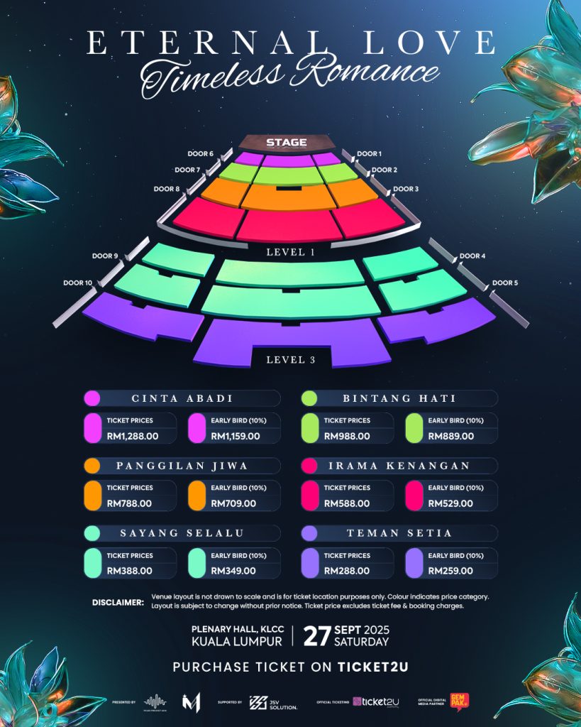 Tiket konsert kini mula dijual secara eksklusif di Ticket2U. Beberapa tempat duduk terpilih akan ditawarkan pada harga istimewa Early Bird dengan kuota yang sangat terhad. Selepas kuota penuh, harga akan kembali kepada harga asal.