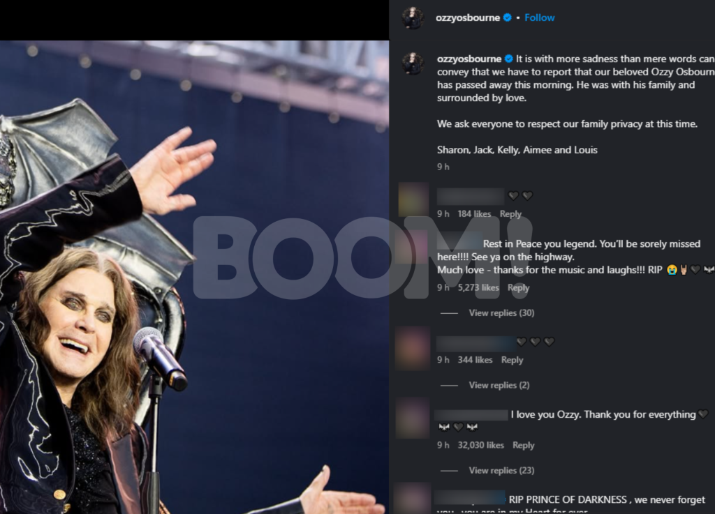 Khabar duka itu disahkan oleh keluarganya menerusi satu hantaran di Instagram, yang menyatakan bahawa pemergian Osbourne berlaku dalam keadaan penuh kasih sayang dan dikelilingi ahli keluarga.