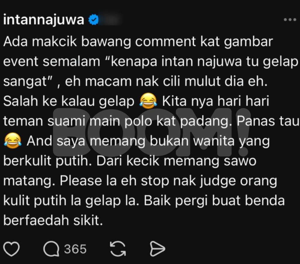 “Ada makcik bawang komen dekat gambar event semalam, ‘Kenapa Intan Najuwa tu gelap sangat.’