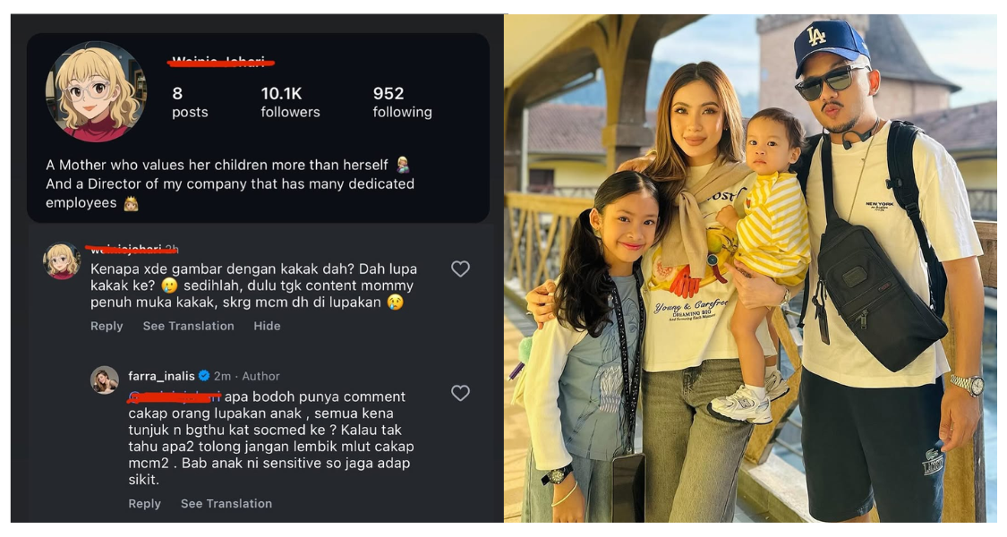 Isteri kepada pempengaruh dan penyanyi rap Caprice, Farra Inalis atau mesra disapa Elis, tampil berang selepas didakwa segelintir warganet kurang berkongsi momen bersama anak sulungnya, Aleesya Sofea.