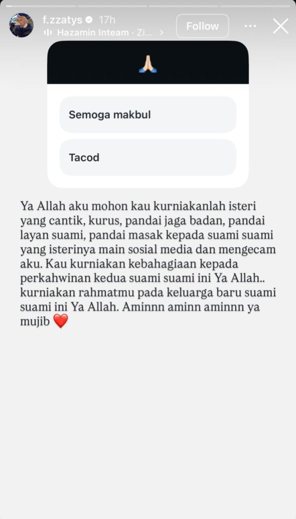 Lebih mengeruhkan keadaan, Fara turut memuat naik hantaran di Instagram Story, termasuk doa yang mengundang perdebatan.