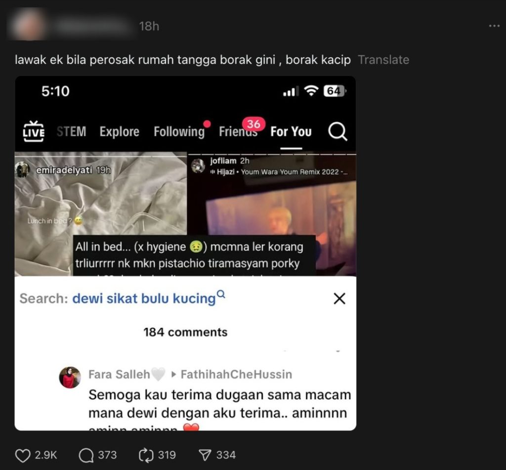 Semuanya bermula apabila Fara meninggalkan komen di sebuah video TikTok yang mengkritik Dewi, isteri kepada Jofliam, yang dikatakan tidak menjaga kebersihan kerana makan dan membersihkan bulu kucing di atas katil.