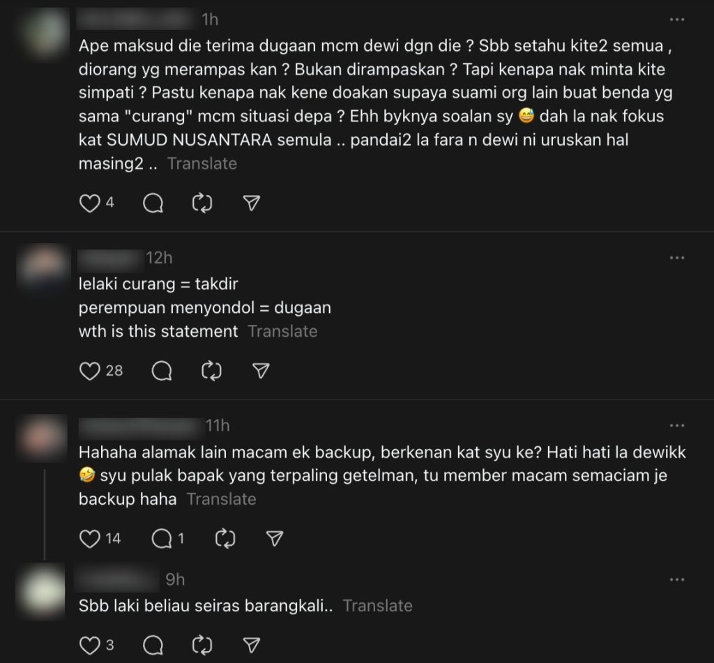 Komen tersebut pantas tular di Threads, sekali gus mengundang pelbagai reaksi netizen yang menempelaknya kerana dilihat cuba mempertahankan Dewi.