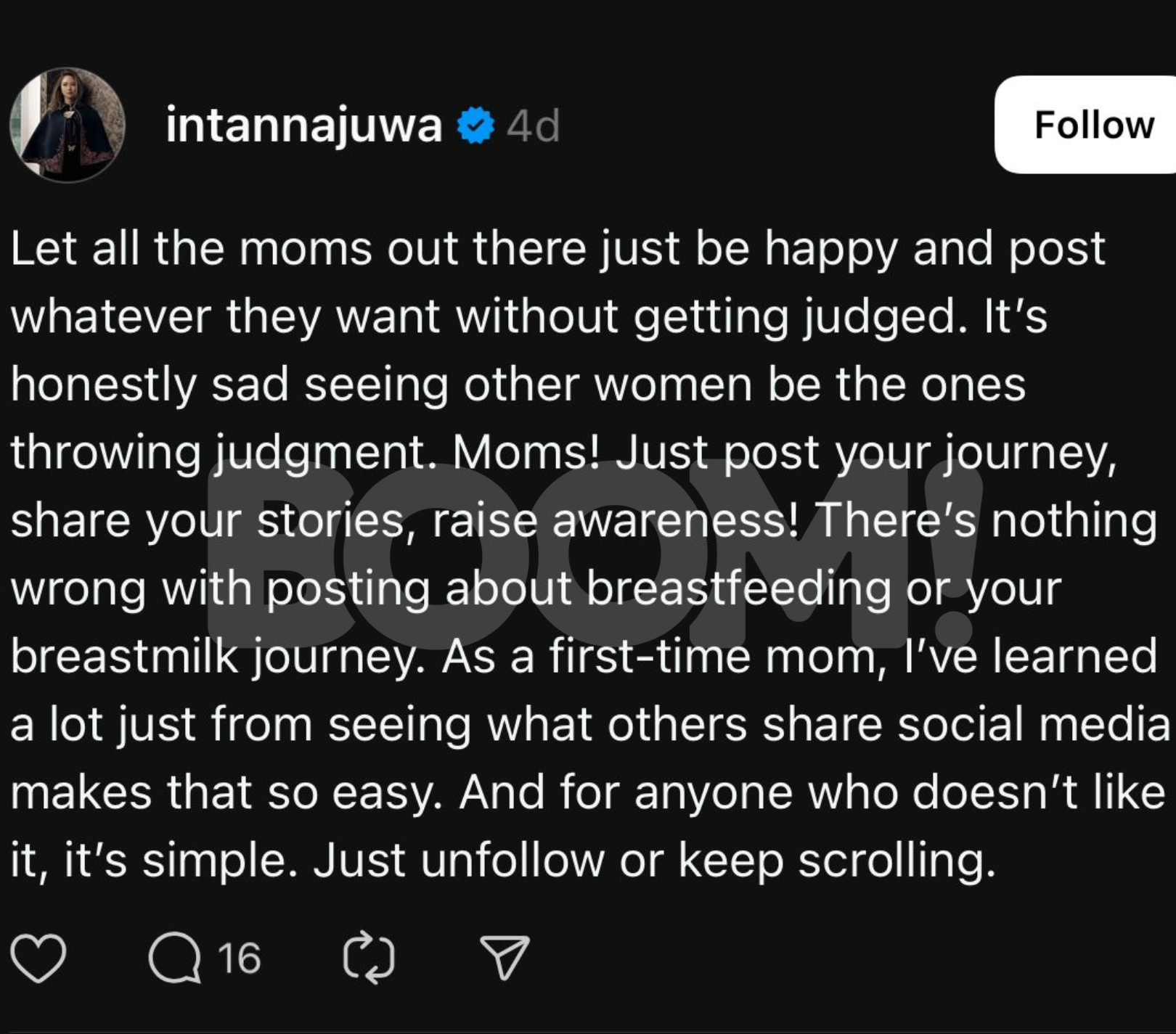 Perkongsian Intan itu di aplikasi Thread mendapat sokongan ramai netizen yang turut bersetuju bahawa penyusuan adalah satu topik penting yang patut dinormalisasikan dalam media sosial tanpa prejudis. – BOOM!