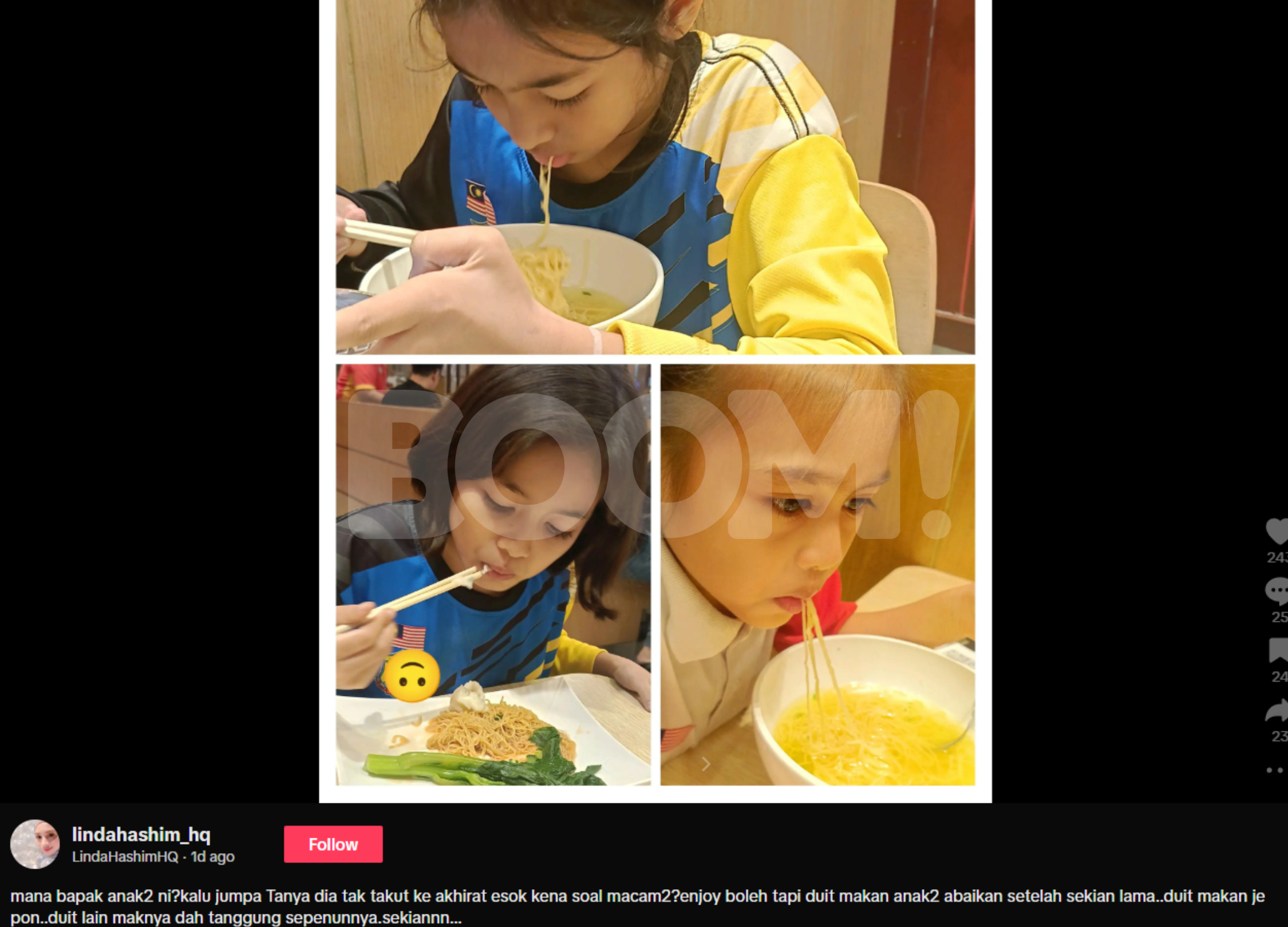 Dalam satu hantaran di TikTok, Linda berkongsi gambar anak-anak mereka sedang makan, sambil menyindir Beego yang didakwa gagal memberikan nafkah.