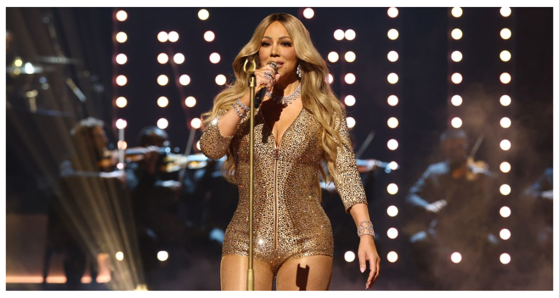 Carey tampil glamor dalam jubah emas sebelum menukar ke bodysuit berkilau serba emas. – BOOM!