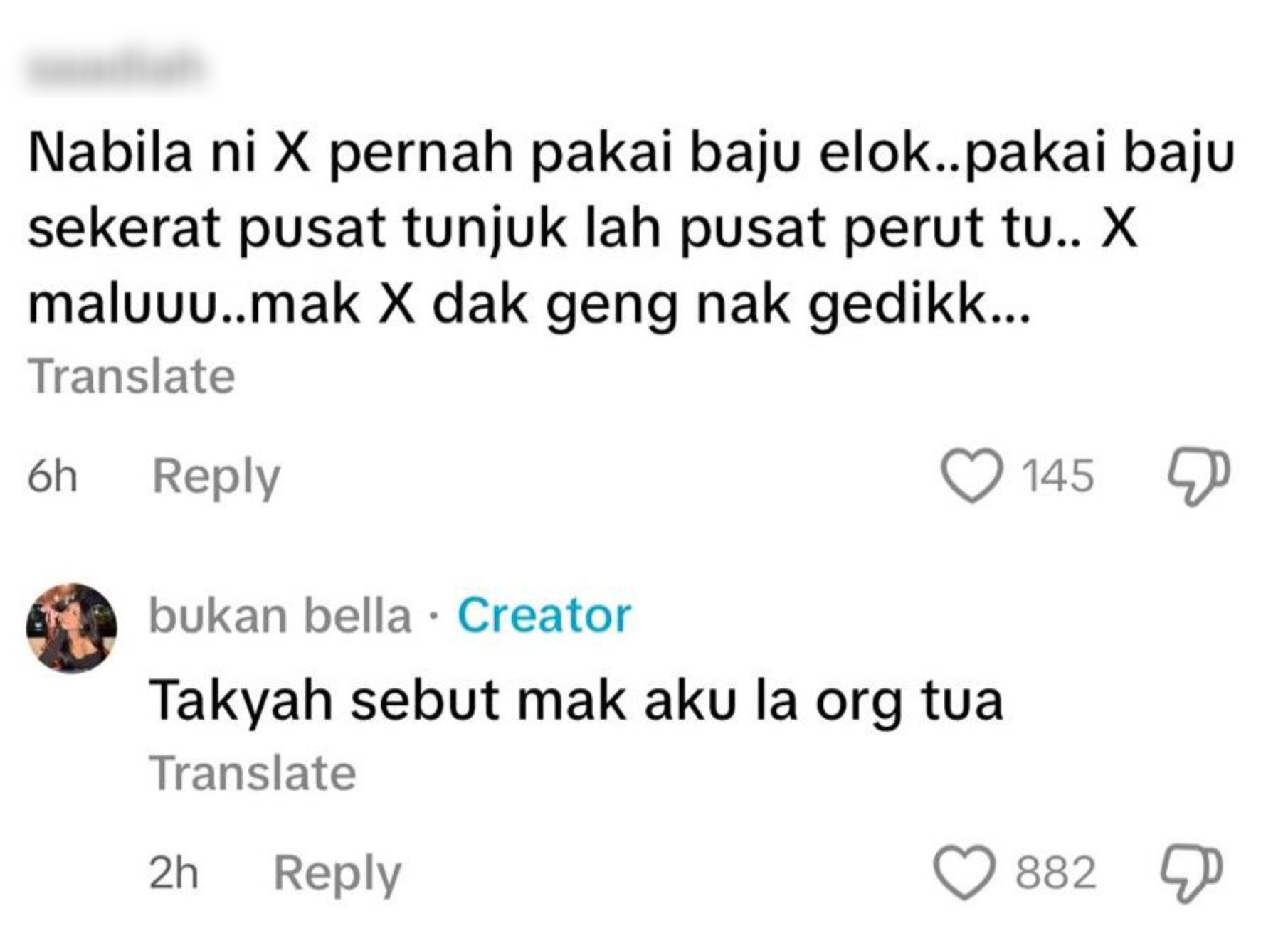 Anak kepada usahawan sensasi Kak KM, iaitu Nabila Razman, tampil membidas komen netizen selepas ibunya dikaitkan dalam satu video TikTok terbarunya.