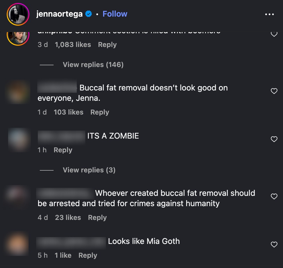 Menerusi beberapa foto yang tular di media sosial, wajah bintang Wednesday itu dilihat lebih tirus dan berbeza daripada sebelumnya sekaligus mencetuskan spekulasi dia mungkin telah menjalani prosedur bichectomy, iaitu pembuangan lemak di bahagian pipi dan dagu untuk meniruskan wajah.