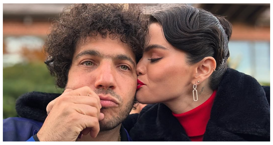 The first photo featured Selena wearing a red halter-neck dress with a black coat, holding Benny’s hand while kissing his cheek.