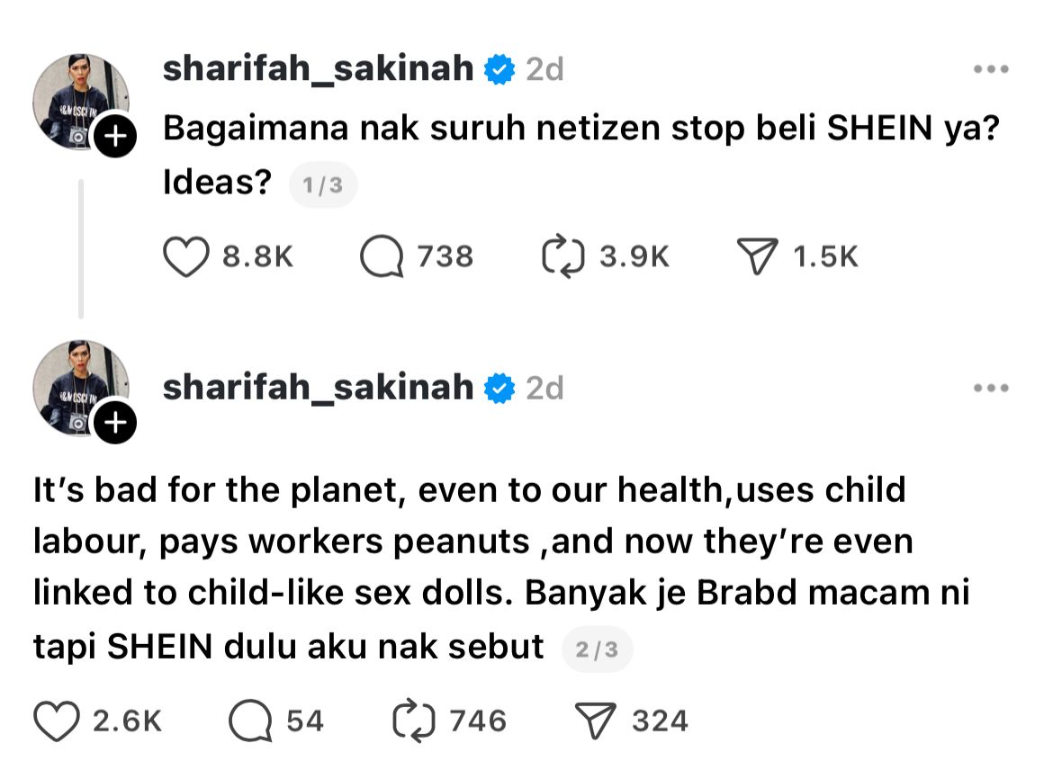 • Sharifah Sakinah Urges Public To Stop Supporting Chinese Fashion Brands