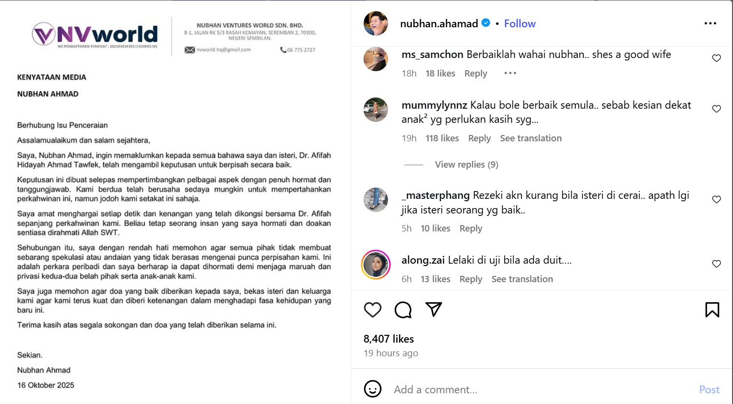 In a statement posted on social media, Nubhan, a former Akademi Fantasia Season 6 contestant, explained that they had tried their best to preserve the marriage, but their fate as husband and wife had reached its end.