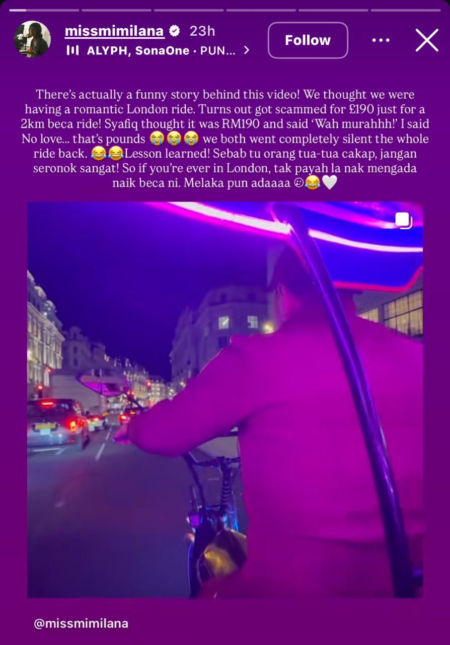 Mimi revealed on Instagram that Syafiq initially thought the fare was only RM190, but later realized it was in British pounds. Both were reportedly speechless throughout the ride after realizing they had likely fallen victim to an overpriced tourist scam.