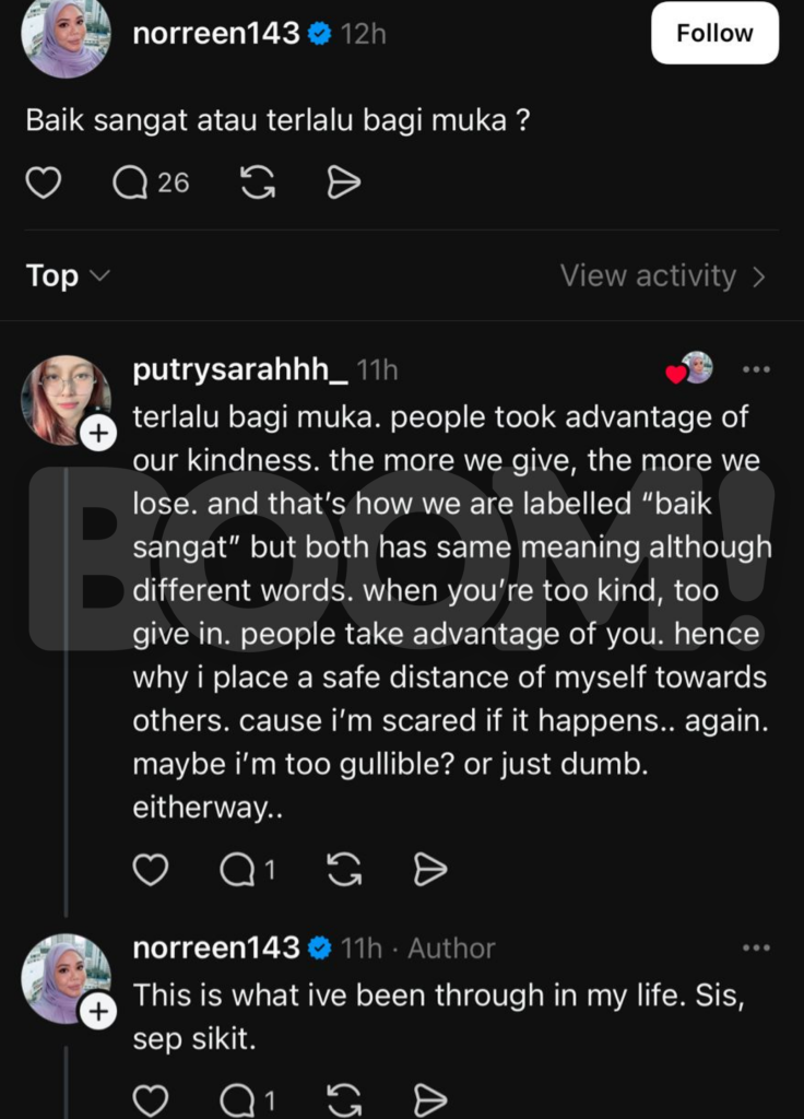 Regardless, netizens generally prayed for Norreen to stay strong and not be taken for granted by those who fail to appreciate her. – BOOM!