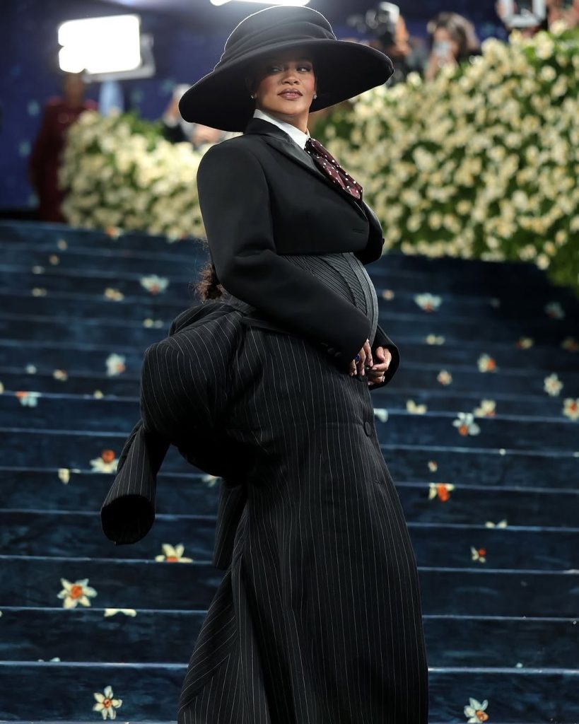 Rihanna, 37, looked stunning while gently rubbing her baby bump at the most prestigious fashion event. This year’s red carpet embraced a navy color theme with daffodil floral accents, aligning with the theme “Superfine: Tailoring Black Style”.