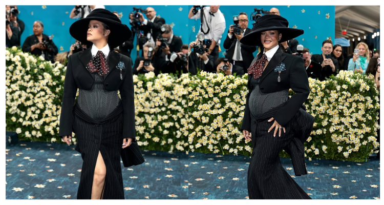 Rihanna, 37, looked stunning while gently rubbing her baby bump at the most prestigious fashion event. This year’s red carpet embraced a navy color theme with daffodil floral accents, aligning with the theme “Superfine: Tailoring Black Style”.